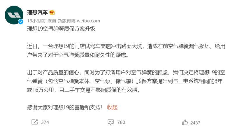 【理想汽车升级L9空气弹簧质保方案】理想汽车在官微表示,一台门店试驾车高速冲击路面大坑,造成右前空气弹簧漏气损坏,带来了对于空气弹簧质量和耐久性的疑虑。决定将L9的空气弹簧质保方案,提升到与三电系统相同的8年或16万公里,且二手车交易不影响质保的有效期。(中证网)