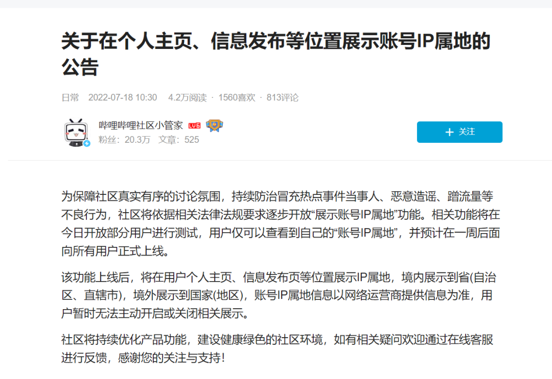 【B站将展示账号IP属地】B站公告,将依据相关法律法规要求逐步开放“展示账号IP属地”功能,将展示至省级行政区,用户无法主动关闭。一周后面向所有用户正式上线。(北青网)