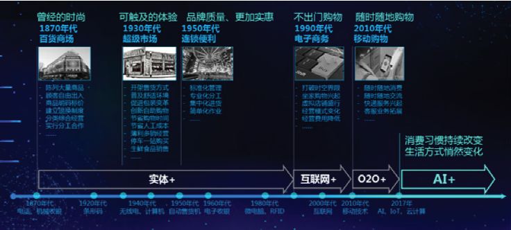 零售历史源远流长。纵观零售发展史(见下图),我们把零售分为“实体 + 零售”的线下零售 1.0 时代、“互联网 + 零售”的线上零售 2.0 时代、“O2O+ 零售”的双线融合时代,以及“AI+ 零售”的智慧零售 4.0时代。
