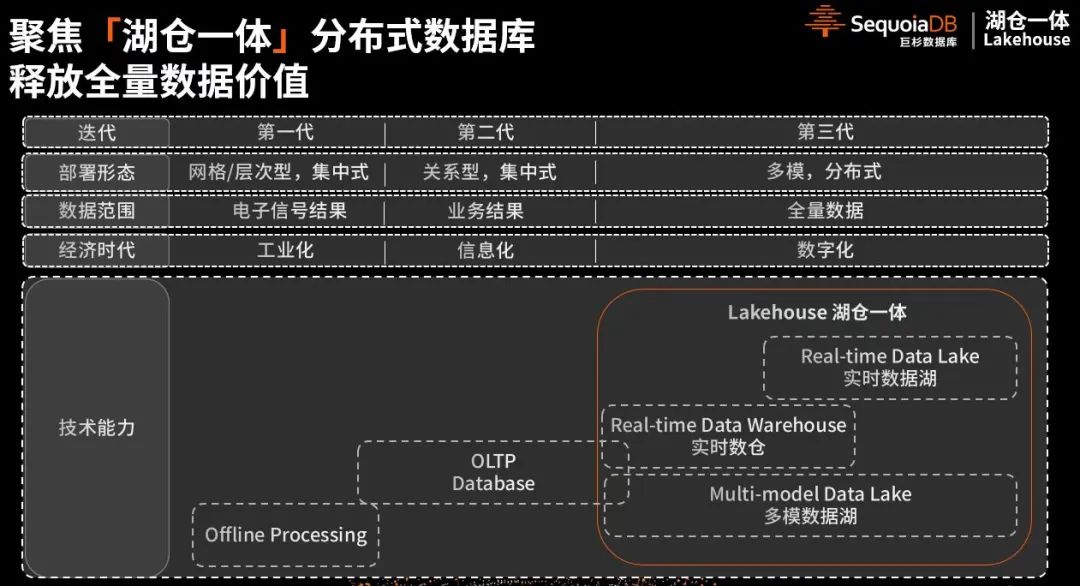 「实时」是「释放全量数据价值」的关键。10 年前,巨杉数据库自萌芽之初就意识到,数据会成为社会发展关键的要素资源,需要提供面向全量数据的实时对客及高并发处理能力。业界遇到的普遍痛点是,面向「交易核心」的数据库因架构及技术限制仅能服务于指定的业务系统,且无法处理全量数据;以 Hadoop 为代表的大数据产品虽然可以存放全量数据,但无法提供实时处理能力,两者皆无法满足全量数据实时对客服务的发展需求。因此巨杉毅然开始了自研原生分布式数据库内核的道路,从「多模数据湖」、「实时数据湖」发展到「湖仓一体」,为客户提供「数据核心」所需的全量数据存储,实时对客服务,及基于统一数据源的分析能力,充分激活客户的离线数据。