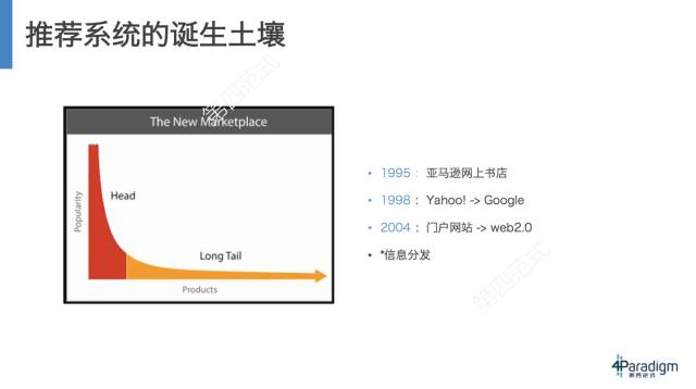 首先讲解一下上世纪90年代—21世纪初,推荐系统诞生的土壤。先描述几个大事件:1995年亚马逊成立网上书店;1998年Google成立,相当于革新了搜索引擎,从以前目录检索式的网站到用户可以随意搜索;2004年,《长尾理论》这本神书问世,书中描述了一个长尾概念,简单来说这个概念就是,如果把世界上的文化产品或者商品做受众统计,可能头部是非常庞大的,但尾部也会非常长,虽然尾部受众人群少,但是这个尾部的所有受众人群加起来也是一个非常庞大的群体,甚至可能会超过头部人群。