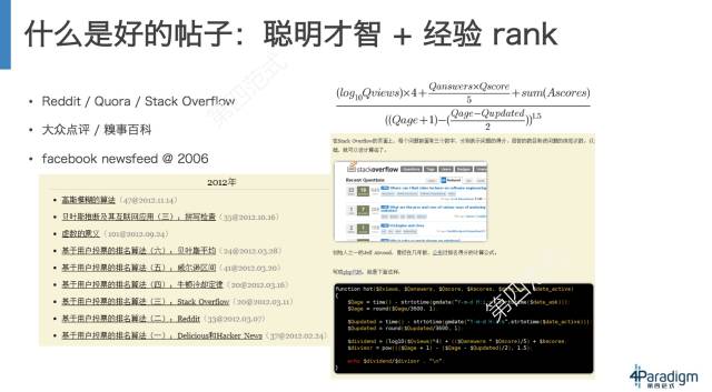 从底下往上看,首先是delicious和hacker news Reddit,他们是通过一些加权的做法。右边的这个截图是Stack Overflow公布的他们当时的做法,也就是我把一个帖子的浏览量做一个log再乘4,加上后面这样一串公式,回答数乘回答分数再除以5,再加上回答的评分。
