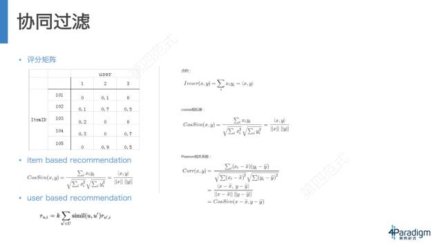 其实还有别的打分方式,比如说一个用户对所有的打分都是偏低的,1234的评分,另一个用户是2345的评分,其实他们的口味和倾向是一样的,这个时候就能用一个pearson来把每个人的得分先减去他日常打分的均值,低于均值是负分,反之是正分,用这个pearson来计算相似程度,用这个相似再得到跟我最相似的朋友,以及这些朋友喜欢什么。同理,如果我把item到user的评分当成一个向量的话也可以做相似操作。