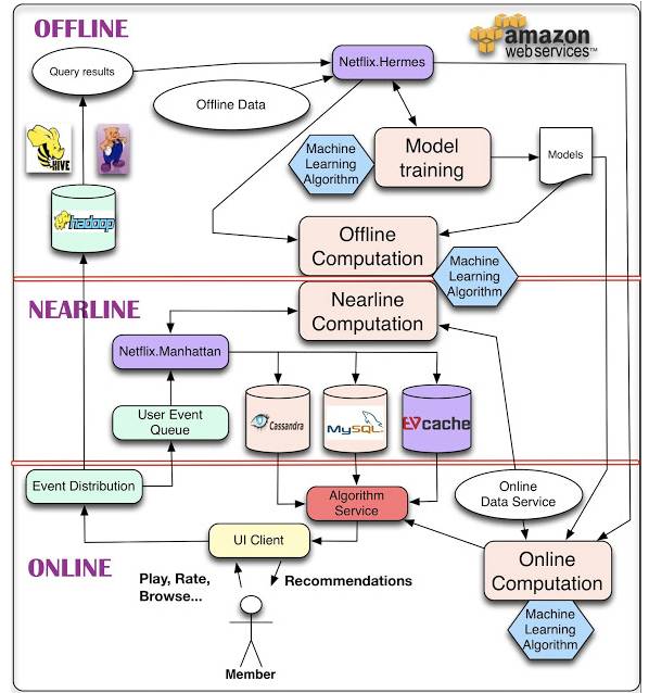 (Netflix内容推荐系统框架图,可以看到整个运算分为三种计算方式,而且其中主要组件包括多种机器学习算法)