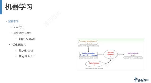 我们不知道f具体是什么,我们只是找到一个最终的假说。这个hypothesis也就是这个g希望尽量接近f。这里面有很多组数据,也就是很多组(x,y),然后有一个假设空间,是H,通过一个算法,在A中搜索到一个最接近f的g,搜索一般会定义一个损失函数,来衡量这个输出,也就是g(x)是否足够接近于结果Y,也就是f(x),他们越接近这个效果越好,然后在这个空间,还会有一个算法,去不断优化这个g,使他越来越接近f。