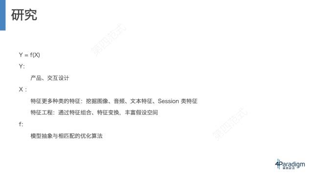 从X的角度来说,有更多的特征种类可以利用,比如被推荐内容的图像、音频、文本特征、session特征,我们有了更多特征,做特征组合和特征变换,如何得到一个更优质的X,以及如何去丰富我们的假设空间,我们如何去抽象我们要处理的问题,去设计与它相匹配的优化算法,这些都是未来的优化方向。
