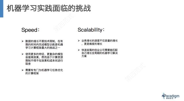 机器学习这一块还有很多挑战。首先是速度,数据的增长是不受技术控制的,尤其是产品成功之后,会有更多的用户、更多的数据和更多特征,如何在有限的时间内完成模型训练更新是机器学习计算框架最大的挑战之一。