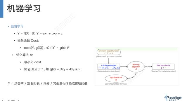有一个算法去优化这件事,尽量使cost小,产生出g,打个比方来说,g(x)=3x1+4x2+2,这种方式,可以Y定义成点击或不点击,看一个电影的时长,也可能是看一个电影给的评分,也可能是量化用户体验和营收的一个方式。