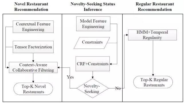 因此,为了区分是推荐去过的餐馆还是推荐新餐馆,我们从用户的历史就餐行为中学习用户对新餐馆的偏好,而这正是用户性格中的猎奇特性。在下一次餐馆推荐时,首先预测用户是否会选择新餐馆,针对新餐馆和去过的餐馆分别设计不同的推荐算法。