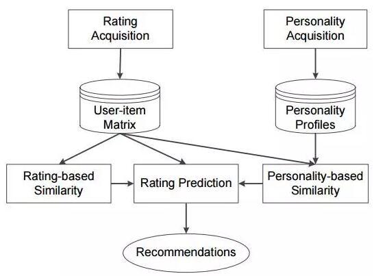 此类算法常常分为两步,首先使用心理学中的调查问卷工具来测量用户的性格特征,然后把用户的性格特征融合到传统的推荐算法中。代表性的工作来自洛桑联邦理工学院的Rong和Pearl,他们在协同过滤的框架中引入了性格特征。