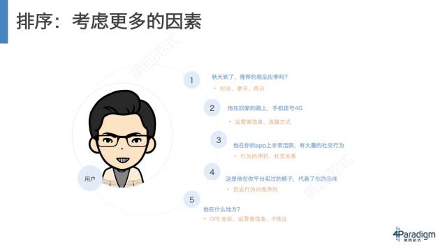 然后在排序这个阶段,之前也提过考虑更多的因素,比如秋天到了,是不是该推荐更多的应季的商品;用户现在用的是4G网,是不是有可能更爱看短的文本内容;用户在APP上很活跃,有很多行为序列,那他的这些序列是不是会有一个行为的迁移,或者这些社交关系能不能带来什么支持。