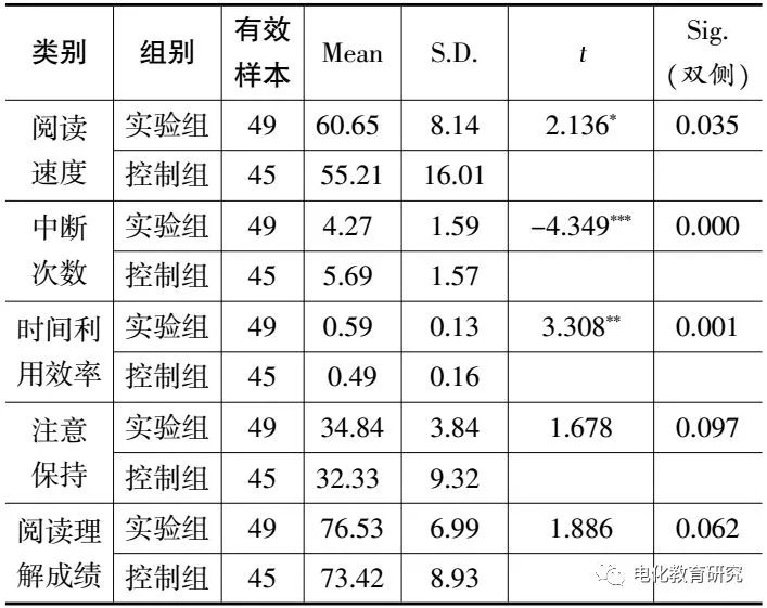 学习效果分为效率和结果两个方面。通过持续6周的实验,可以看到实验组学习者在时间利用、阅读中断等效率指标方面得到了显著的改善。这一现象说明他们在阅读过程中调动了更多的积极因素,努力将自己的注意力保持在阅读活动中,从而提升了学习的效率。C.Chen和S.Huang从脑科学的角度对这种改变进行了诠释,他们发现基于脑电信号的注意力测量和信息反馈不仅能够帮助学习者调整专注度、努力程度、时间利用效率,还有益于激发阅读兴趣和积极性[24]。