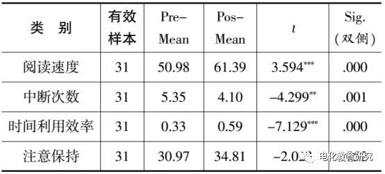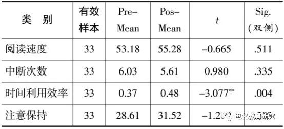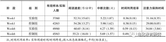 实验组和控制组在实验前后表现出不同的学习投入特征。实验组学习者在阅读速度、阅读中断次数、时间利用效率指标上得到了显著的改善。控制组在时间利用效率上也得到了一定的提高。值得注意的是,学习者在平均注意力保持时间上并没有显著的提升。这种现象可能是成人学习者在注意力保持时间上已经达到了一个相对稳定的水平。