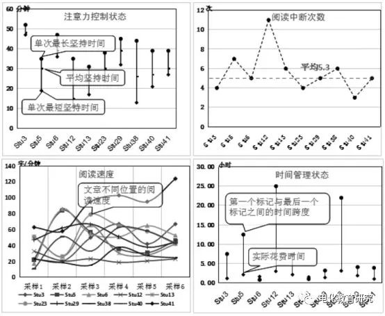 阅读学习分析结果应用上,采取直接反馈的方式,为学习者呈现阅读速度、阅读中断次数、时间利用效率、注意力控制状态四项内容。各项数据均以可视化的形式反馈给学习者。反馈的信息不仅包括学习者个体阅读投入状态信息,还包括群组状态。图2展示了部分学习者的阅读投入状态信息。