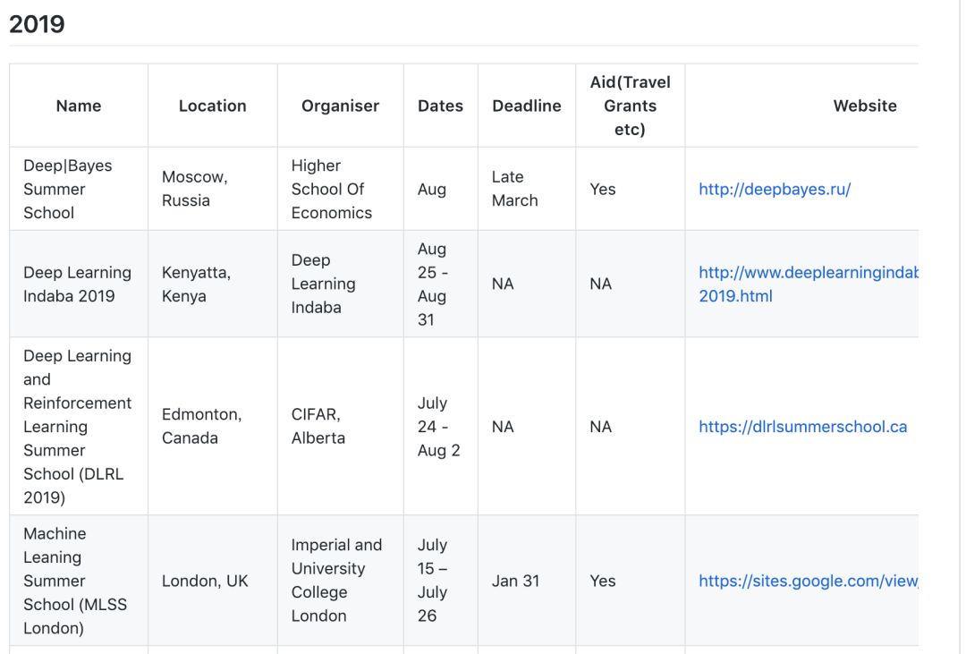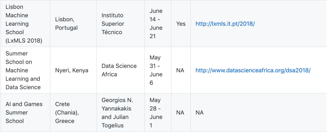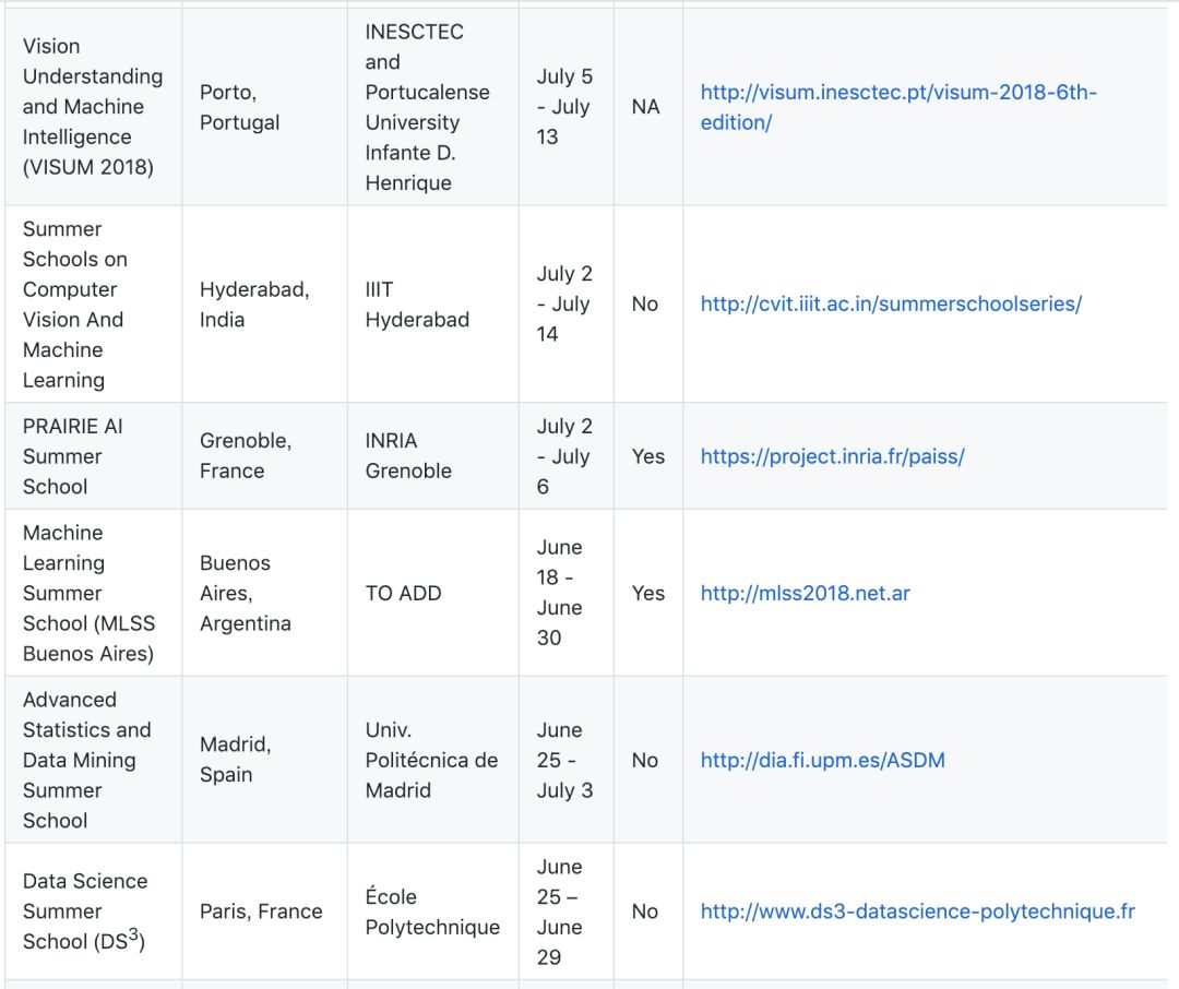 在此列表中,作者列出了这些暑期学习的开办地点、组织方、日期、截止日期、是否有资助等信息。其中包括我们所熟知的由 CIFAR 等机构主办的 DLRL 暑期学校。