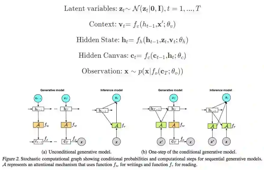 该模型是现有模型(如 DRAW [4]、复合 VAE [5] 和 AIR [6])的泛化。然而,它引入了隐藏的 canvas 步骤,其允许在隐藏空间中构造预图像。另一个需要注意的是,它允许对模型进行采样,而不将画布 ct 的结果反馈到隐藏状态 tht,这会使其更高效。