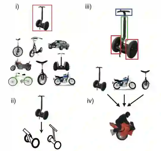 论文 [1](上图)的图 1 中的示例很好的描述了它。当给定(i)的红色框中的单个对象时,可以对下面的对象进行分类,无论它是否是类似类型。此外,人类可以创建类似于(ii)中的样本。人类也可以如(iii)中所示把它解析成三个较小的部分并且幻想如(iv)中所示的新样本。