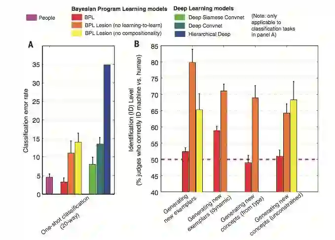 给定新字符的单个图像,分类任务是从 20 个不同字符中选择相同类型的图像。结果如文章 [1] 的图 6A 所示(下图)。BPL 和人类显示出了相似的错误率(3.3%和 4.5%)。