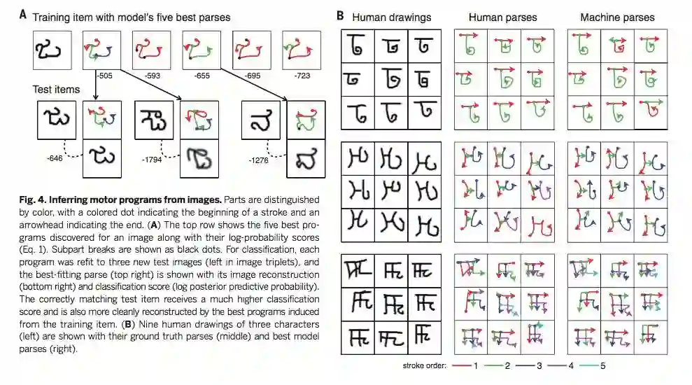文章 [1] 的图 4(下图)显示了 BPL 如何通过解析来学习一个新的图形。左侧面板显示了给定一个示例的最好的五个学习解析,以及如何用它来重新适配一个新的样本。右面板将机器解析与实际情况,即人是如何解析它们的,进行比较。