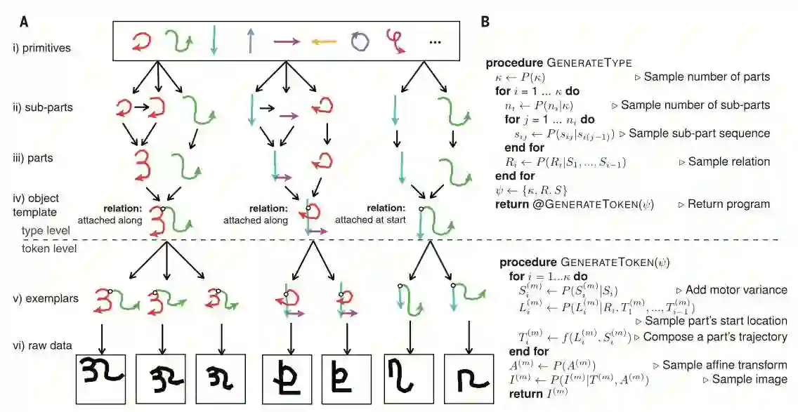 上面的例子很好地解释了 BPL 的三个基本思想。字符可以被认为是从简单原语(「B」由一个直棒和半圆构造而成)构成。基于笔划和停顿进行解析的事实抓住了真实世界过程的自然因果结构。此外,通过「开发能让以前的经验来助于学习新概念的分层先验」,来让模型学会学习 [1]。(分析「B」学习了新的,原语和关系,其稍后可以很容易地用于学习其它字符)。