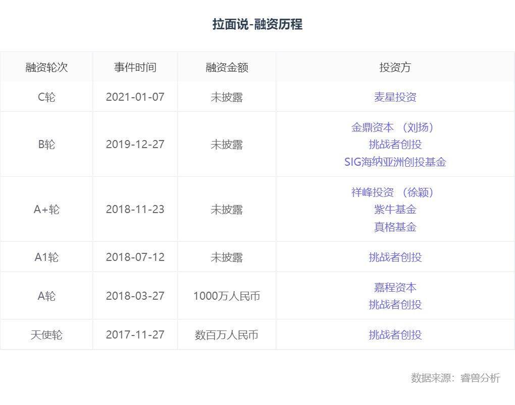 拉面说的快速增长,背后也离不开资本支持。创业邦旗下睿兽分析的数据显示,拉面说至今共完成6轮融资。
