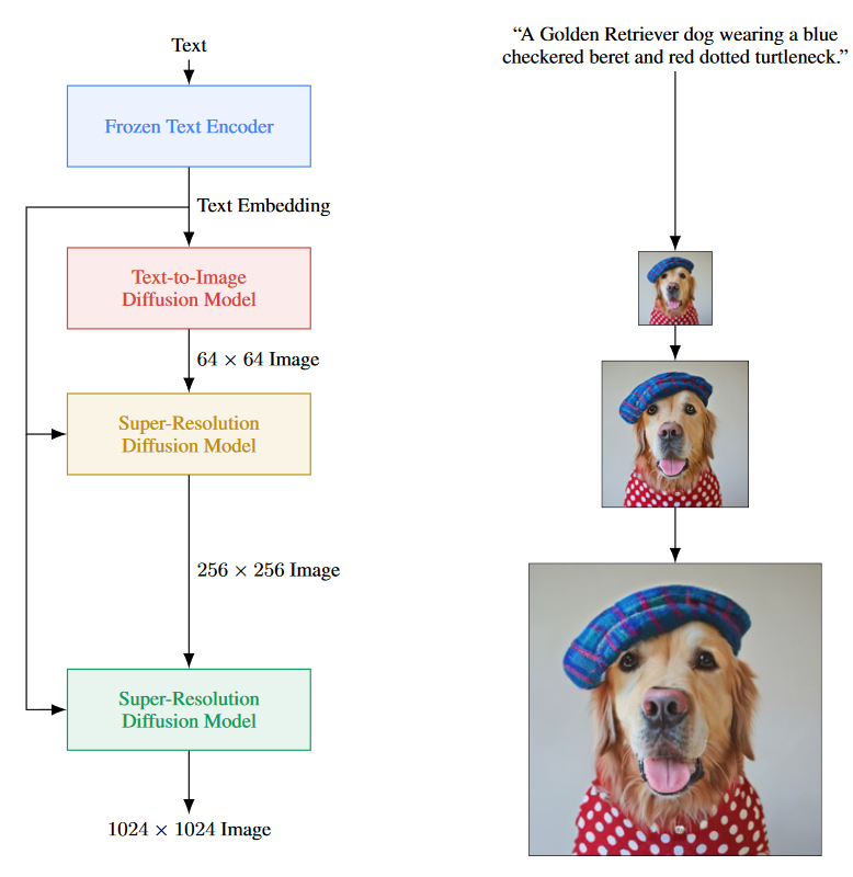 Imagen  [6]  生成模型还没有公布代码和模型,从论文中的模型结构来看,似乎除了文本编码器之外,是由一个文本-图像扩散模型来实现图像生成和两个超分辨率扩散模型来提升图像质量。
