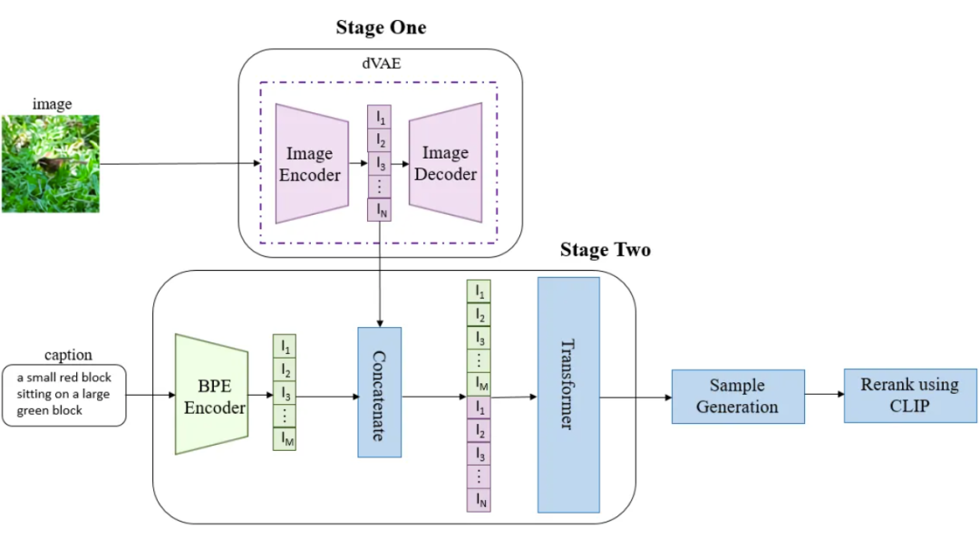 DALLE-1  [4]  模型结构如图所示,首先图像在第一阶段通过 dVAE(离散变分自动编码机)训练得到图像的 image tokens。文本 caption 通过文本编码器得到 text tokens。Text tokens 和 image tokens 会一起拼接起来用作 Transformer 的训练。这里 Transformer 的作用是将 text tokens 回归到 image tokens。当完成这样的训练之后,实现了从文本特征到图像特征的对应。