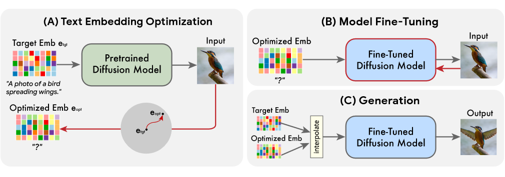 最新的 Imagic 模型  [7] ,号称可以实现通过文本对图像进行 PS 级别的修改内容生成。目前没有公布模型和代码。从原理图来看,似乎是通过在文本-图像扩散模型的基础上,通过对文本嵌入的改变和优化来实现生成内容的改变。如果把扩散模型替换成简单的 encoder 和 decoder,有点类似于在 VAE 模型上做不同人脸的生成。只不过是扩散模型的生成能力和特征空间要远超过 VAE。