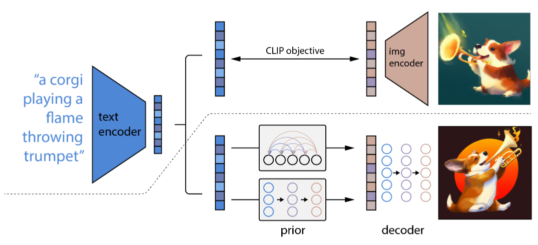 DALLE-2  [5]  模型结构如图 6 所示。其中的 text encoder 和 image encoder 就是用 CLIP 中的相应模块。在训练阶段通过训练 prior 模块,将 text tokens 和  image tokens 对应起来。同时训练 GLIDE 扩散模型,这一步的目的是使得训练后的 GLIDE 模型可以生成保持原始图像特征,而具体内容不同的图像,达到生成图像的多样性。