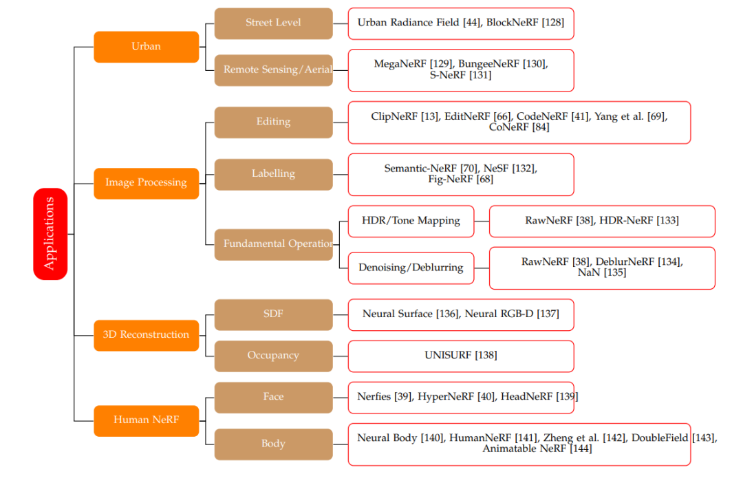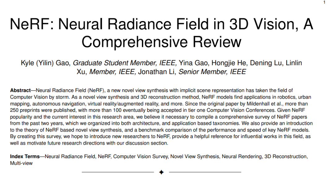 神经辐射场(NeRF)模型是一种利用多层感知器(MLPs)进行隐式神经场景体绘制的新型视图合成方法。在ECCV 2020年由Mildenhall等人[1]首次介绍,NeRF已经达到了最先进的视觉质量,产生了令人印象深刻的演示,并启发了许多后续的作品源自这种新颖的方法。在最近的过去(2022年),NeRF模型已经在照片编辑、3D表面提取、大型/城市规模的3D表示和视图合成中找到了应用。NeRF模型比其他新视图合成和场景表示方法有一些关键优势。