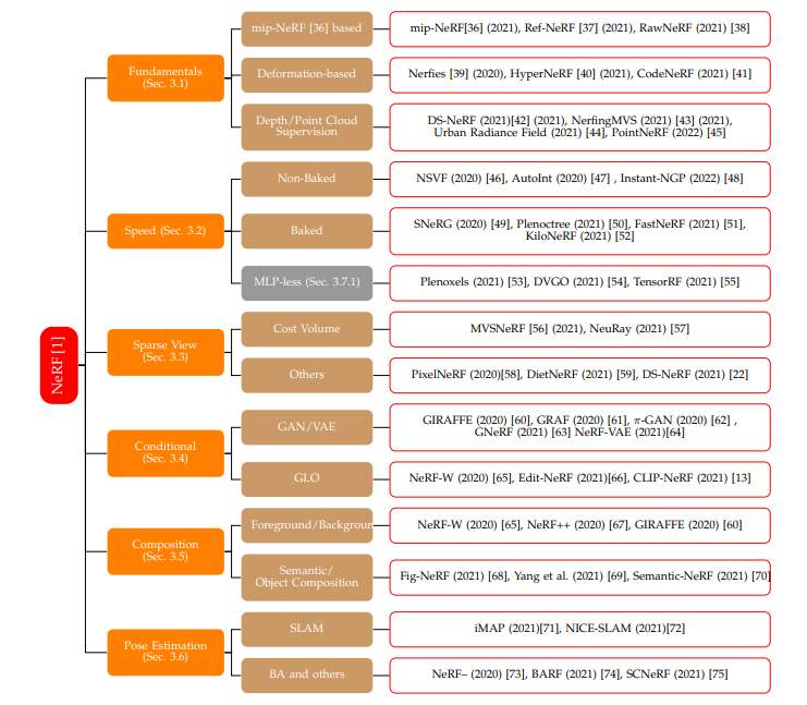 这篇手稿的其余部分组织如下。第2节介绍了现有的NeRF调查预印本(2.1),解释了NeRF体绘制背后的理论(2.2),介绍了常用的数据集(2.3)和质量评估指标(2.4)。•第三部分是论文的核心,介绍了有影响力的NeRF出版物,并包含了我们创建的分类来组织这些作品。它的子部分详细介绍了在过去两年中提出的不同的NeRF创新家族,以及最近NeRF模型在各种计算机视觉任务中的应用。第四和第五部分讨论了未来可能的研究方向和应用,并总结了调研结果。