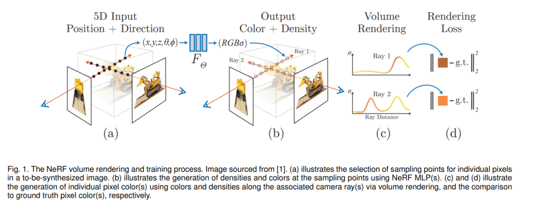 Mildenhall等人[1]于2020年首次提出神经辐射场用于新视图合成。NeRFs实现了复杂场景的高度真实感的视图合成,在该领域引起了广泛关注。在其基本形式中,NeRF模型将三维场景表示为由神经网络近似的辐射场。辐射场描述了场景中每个点和每个观看方向的颜色和体积密度。