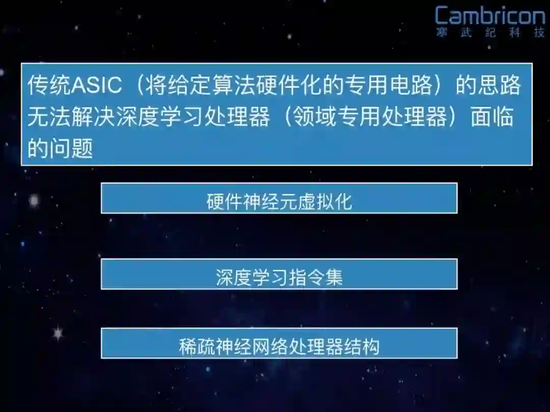 第一个问题:如何用有限规模的硬件支持现在规模越来越大的神经网络类型的算法。因为就算500平方毫米的芯片,也就一百多亿个晶体管,但是现在神经网络的算法规模却越来越大。
