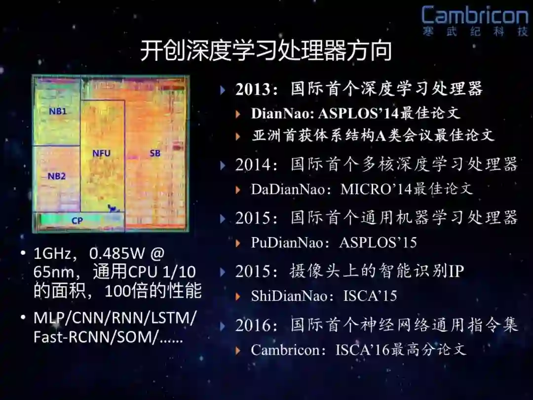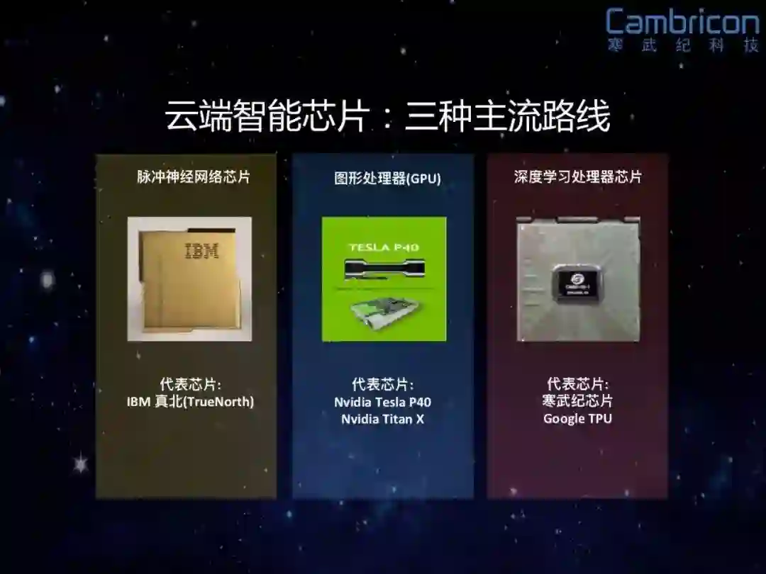 第三种,也是目前绝大多数做智能芯片的公司在做的,叫做"深度学习处理器",应用领域集中在深度学习处理的范围内。寒武纪就是在做这类芯片,包括谷歌的TPU、地平线、深鉴科技等,基本都是做这类芯片。
