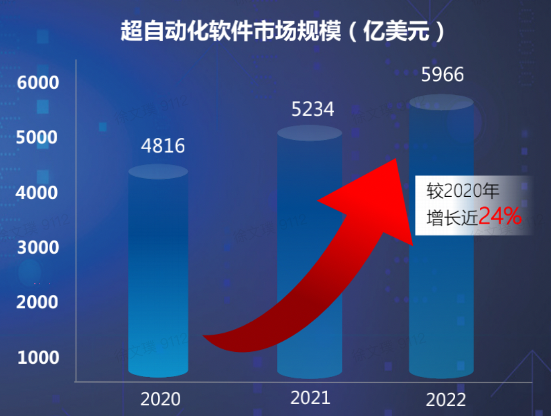 从行业发展看,不光国内的超自动化厂商在寒冬下仍能获得资本青睐,国外在超自动化领域不光有公司成功上市,更有估值百亿美元的独角兽领跑细分赛道。Gartner预测,2022年全球范围内的可支持超自动化软件市场会达到近6000亿美元,较2020年增长近24%。