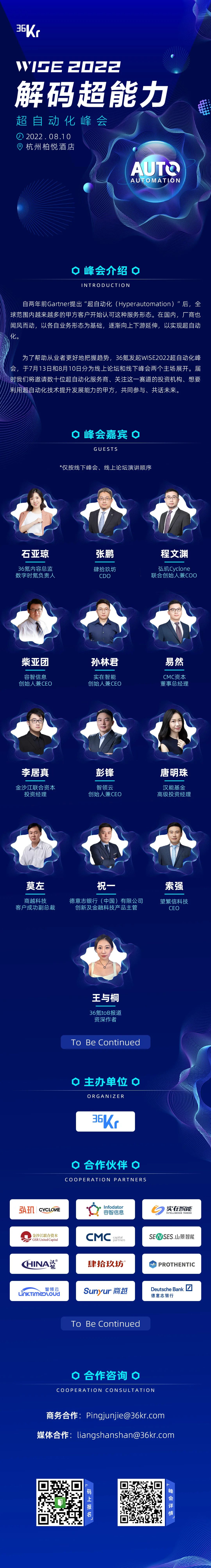 为了进一步关照行业发展难点,厘清发展重点,从商业角度看超自动化目前的落地情况等等,36氪发起WISE2022超自动化峰会,于7月13日和8月10日分为线上论坛和线下峰会两个主场展开。其中7月13日线上论坛,我们邀请到了弘玑Cyclone、智领云、商越科技、繁望信、CMC资本、金沙江联合资本、汉能基金、德意志银行(中国)有限公司等关注超自动化领域的甲乙方企业、投资机构,以对谈的形式与大家共话“超能力”。