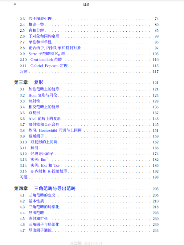 本卷的编写精神大致上和卷一类似, 但由于处理的内容不同, 具体风格也有所改变. 这些差异只能在未来的导言里仔细解释. 如同卷一, 本书并不鼓励初学者循序阅读, 除 非对抽象方法已经有充分高的接受度. 具体的阅读须知将见于导言和每章开头, 遗憾的 是这些内容只有待全书定型后方能撰写. 编撰过程中广泛参考了各种相关著作, 一部分已在正文引用, 剩余部分计划待全书 完成后在导言部分列出, 并非有意遗漏, 敬请谅解. 当前内容大致相当于传统上的同调代数, 这是本真意义的 “线性代数” 的一个真子 集. 从现代的观点看, 前五章达到了一个勉强够用的体系, 但即使作为经典同调代数的。