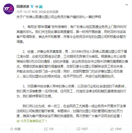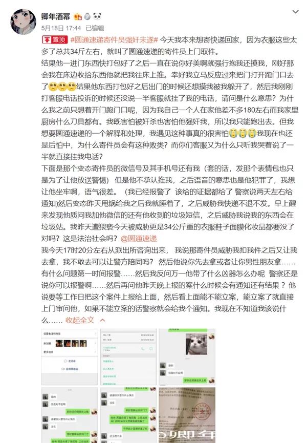 日前,一位网友在微博称圆通快递员上门取件时对其进行骚扰非礼。据该女孩讲述,圆通快递员上门取件时强抱强摸猥亵,她报警后快递员仍发微信不断威胁,并扬言不会给她寄件,她的东西会在垃圾站。女孩在事情发生后,拨通圆通客服电话反映情况投诉,但说到一半,客服就将电话挂断,之后圆通甚至打电话要求女孩删掉微博。