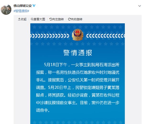 女孩对此事也已作报警处理报警,今天上午@佛山禅城公安 通报表示涉事快递员已被抓获。
