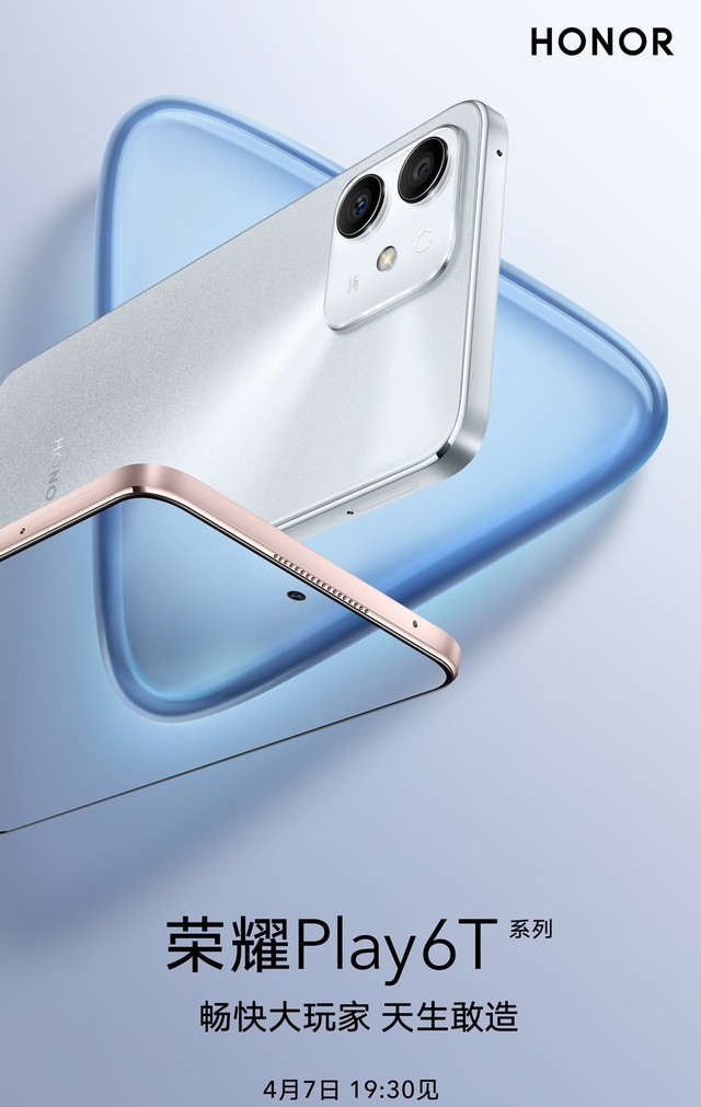 今天上午荣耀手机官方宣布将于 4 月 7 日 19:30 发布性价比机型荣耀 Play 6T 系列,同时新机的官方预热海报一并放出。据官方海报中信息,这款手机整体采用直角边框的方案,还配有一颗居中打孔的全面屏,屏占比也是比较高。另外,荣耀 Play6T 采用了类似 iPhone 12 的后摄排列,整个模组为矩形设计,竖直排列两颗摄像头,以及一颗闪光灯。此外,还有信息曝光称,荣耀 Play 6T 前置摄像头为 800 万像素,后置 4800 万 +200 万像素组合,电池容量 3900mAh,支持 40W 快充。