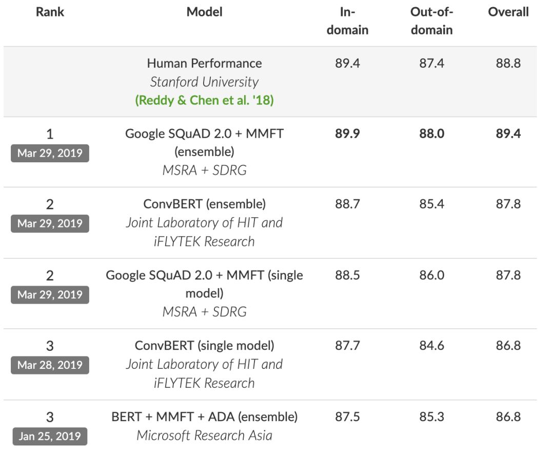 据 CoQA 榜单显示,微软研究团队提交的集成系统分布取得了 89.9 的领域内得分、88.0 的领域外得分、89.4 的整体 F1 得分,而在此数据集上人类的表现分别为 89.4/87.4/88.8。