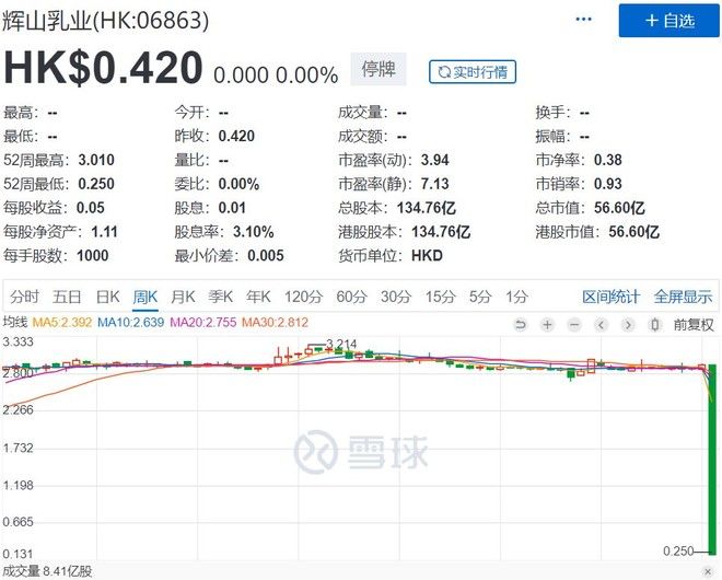 港股$辉山乳业(06863)$ 2017年3月24日被浑水打假做空后当天暴跌85%,停牌至今