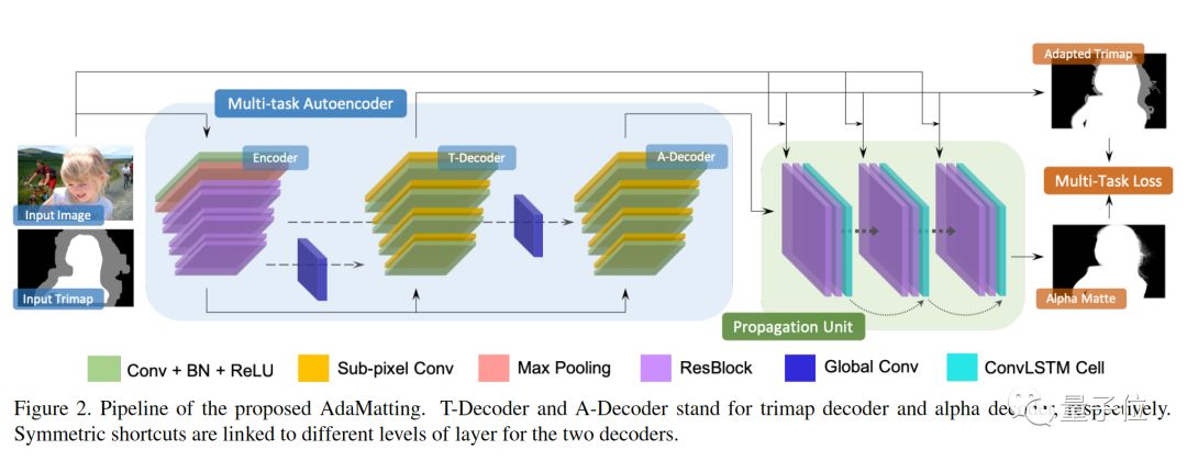 本文指出,之前解法实际上将两个不同的问题混在了一起:1. 区分待确认区域中的前景、背景和混合像素; 2. 为混合像素精确地计算阿法值。其中我们称第一个任务被称为三分图调整 (Trimap Adaptation),第二个任务为阿法值估计 (Alpha Estimation)。其中三分图调整是典型的分类问题,阿法值估计是典型的回归问题,本文提出的端到端的 AdaMatting 框架,通过使用多任务学习 (Multi-task Learning) 的方式分开解决这两个问题,在多个图像数据集上的所有常用指标中取得了目前最佳的结果。