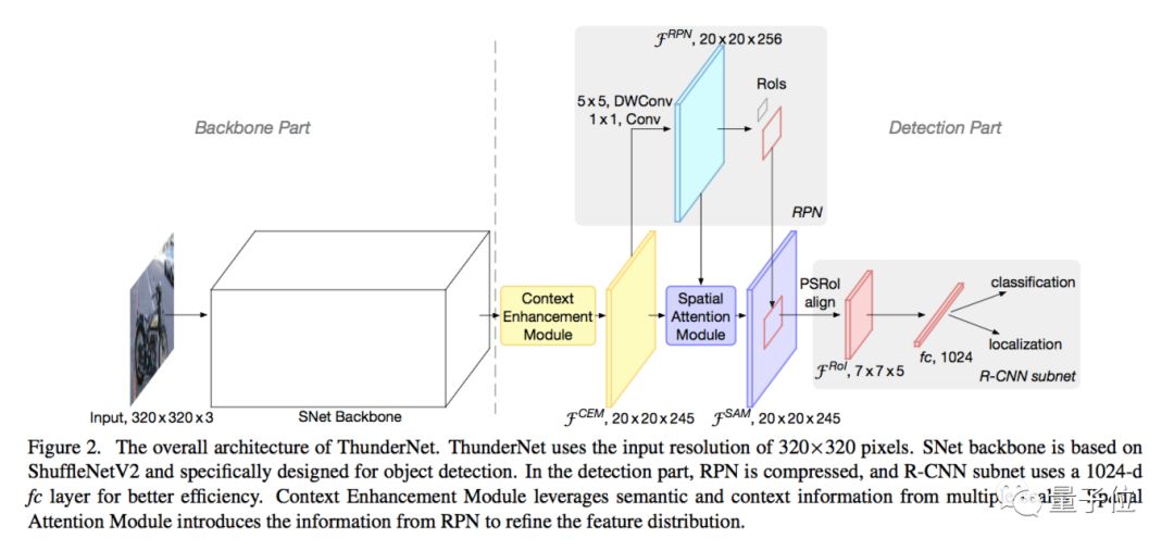 在这篇文章中,我们探索了两阶段目标检测模型在移动端实时目标检测任务上的有效性,并提出了一种轻量级的两阶段目标检测模型ThunderNet。在骨干网部分,我们分析了之前的轻量级骨干网络的缺点,并提出了一种针对目标检测任务设计的轻量级骨干网络。在检测网部分,我们采用了极为简洁的RPN和检测头的设计。为了产生更有判别性的特征表示,我们设计了两个网络模块:上下文增强模块(CEM)和空间注意力模块(SAM)。最后,我们探讨了轻量级目标检测模型的输入分辨率、骨干网和检测头之间计算开销的平衡关系。