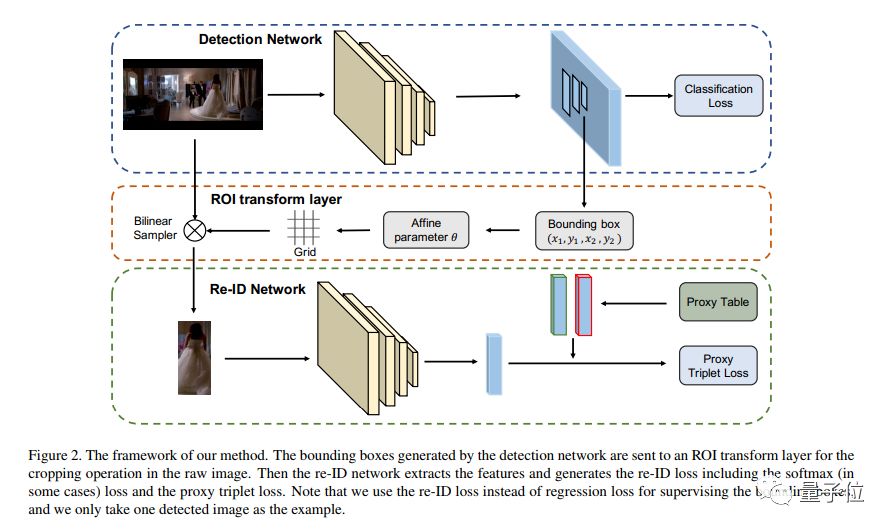 在本文中,我们以行人搜索任务为例,提出了一种新的优化检测框定位精度的方法,使其更加适合给定任务。行人搜索旨在从完整的图片中检测并识别行人,分为检测和行人重识别(Re-ID)两个任务。文章提出一种re-ID驱动的定位调整框架,用re-ID loss对检测网络产生的检测框进行微调。文章设计了一个可导的ROI转换模块,能够根据检测框的坐标从原图中crop出对应位置图片,再送入re-ID网络。由于整个过程可导,re-ID loss能够对检测框的坐标进行监督,从而使检测网络能够生成更适合行人搜索这个任务的检测框。