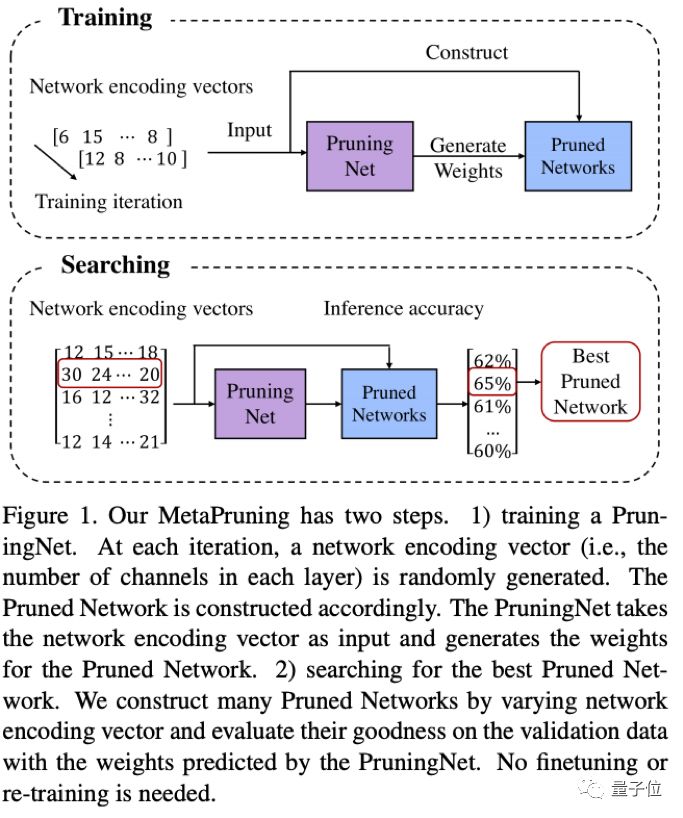 传统Pruning往往需要人工或基于一些经验准则设定各层的压缩比例,然后迭代选择去除哪些channel,这个过程较耗时耗力。MetaPruning,跳过选择哪个channel,直接搜索每层保留多少channel。为了既高效又准确地找到最优的每层channel组合,MetaPruning 首先训练一个PruningNet,用meta-learning预测各个可能的裁剪后网络(PrunedNet)的精度。借用Network Architecture Search的思想,用进化算法搜索最优的PrunedNet。PruningNet 直接为PrunedNet预测了可靠的精度,使得进化搜索非常高效。