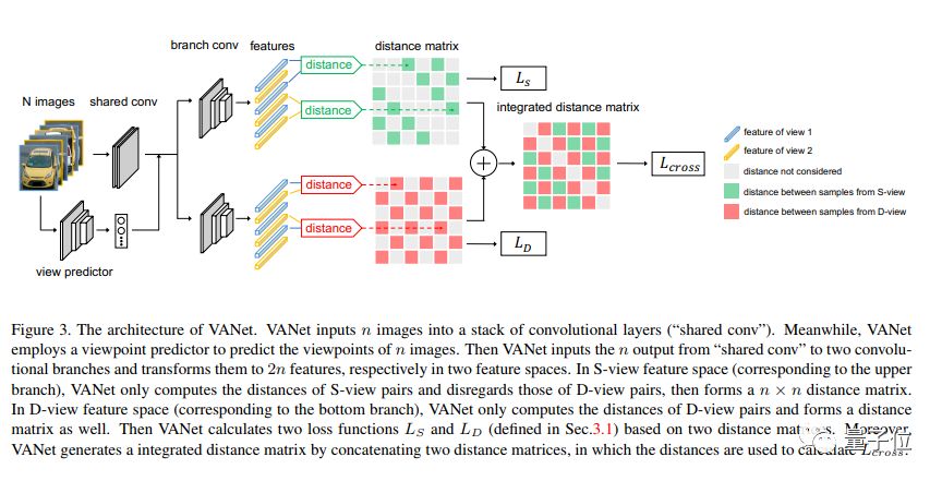 受到人类识别车辆时认知方式的启发,我们提出了一种基于视角感知的度量学习方法。该方法针对相似视角和不同视角,分别在两个特征空间学习两种度量标准,由此产生了视角感知网络(VANet)。在训练过程,我们施加了两种约束进行联合训练。在测试过程,我们首先估计车辆的视角,并基于估计结果采用对应的度量方式进行度量。