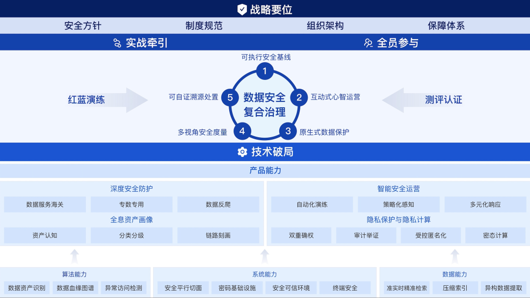 数据安全治理科技从系统能力、算法能力、数据能力和产品能力四大维度阐述了如何建设与完善数据安全治理的技术体系。系统能力包括安全平行切面、密码基础设施、安全可信环境、终端安全等,旨在构建安全可信的系统和环境支持,为数据安全治理提供底层环境支撑。算法能力重点关注数据资产识别、数据血缘图谱、异常访问检测等智能算法建设,应对数据安全治理中的“看见数据”、“看清数据”和“理清风险”三大难题。数据能力主要提供准实时精准检索、压缩索引、异构数据提取等数据加工能力,实现大规模数据的准实时快速定位。产品能力旨在从全息资产画像、深度安全防护、智能安全运营、隐私保护与隐私计算等领域出发,构建从数据资产识别到动态安全管控到智慧安全运营到数据价值利用的全方位、体系化的产品能力,满足不同数据安全治理场景下的技术需求。