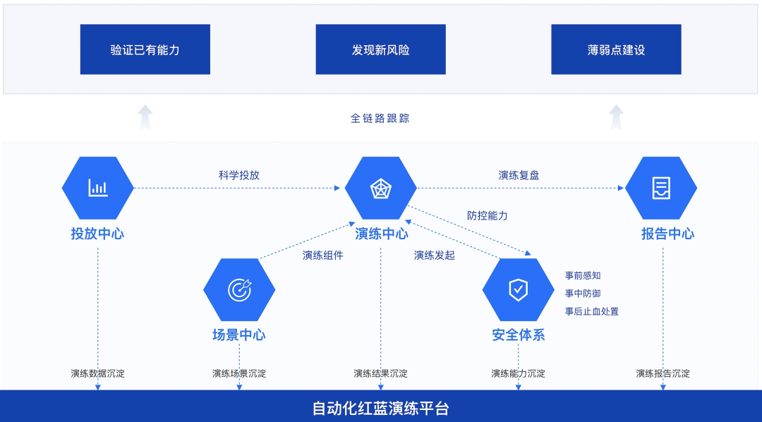 建立智能化的安全运营机制,以进一步提升数据安全治理的自动化水平和效率。以红蓝演练为例,通过沉淀自动化、模块化、组件化的红蓝演练能力,制定演练科学投放的策略,并建设全链路风险跟踪能力,形成常态化的红蓝演练机制,从攻防视角更加高效、及时地识别和修复安全风险,实现“以攻促防、攻防相长”的目标。