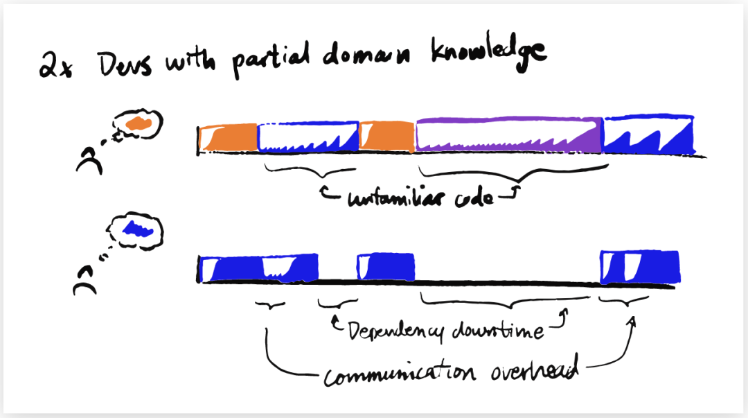 这两个开发人员的优势是他们可以并行地构建单独的块,但他们的并行性受到串行依赖关系 (一些块必须先于其他块放置)、理解不熟悉的代码和沟通成本的限制。